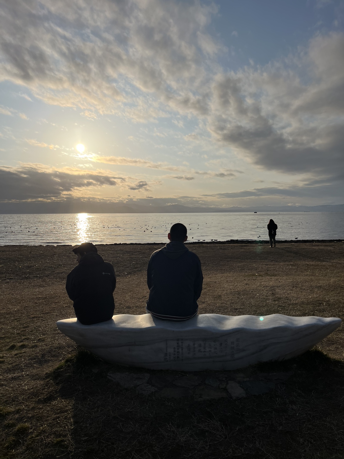 公園から眺める琵琶湖はとても美しく、ちょうどサンセットの時間帯。水辺には多くの水鳥や野鳥が集い、澄んだ空気の中でゆったりとした休憩時間を過ごすことができました。